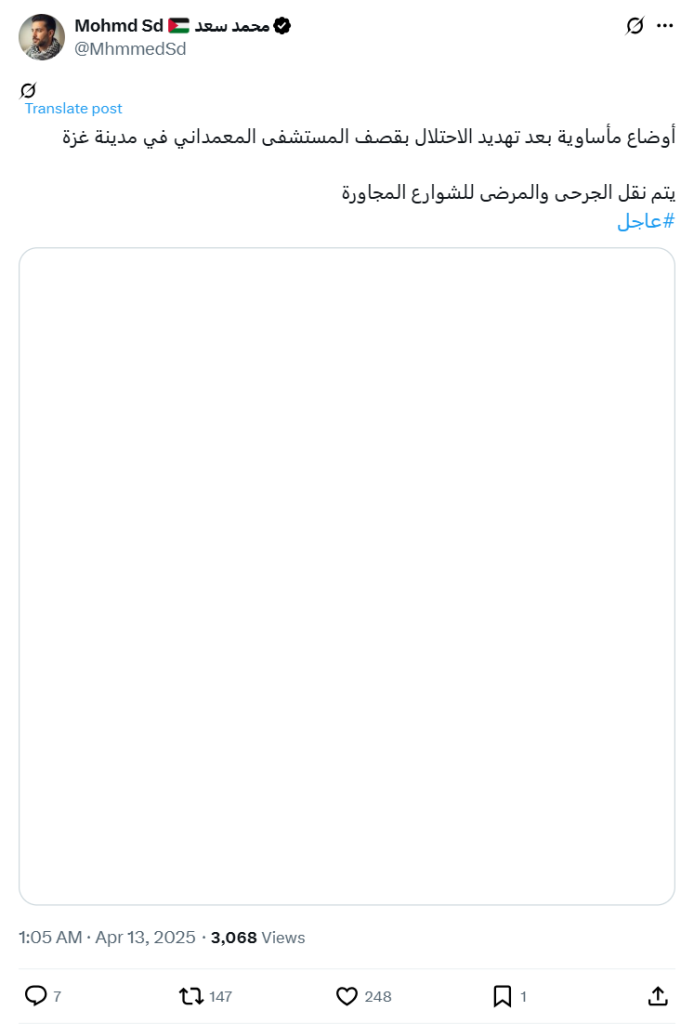 Tragic conditions after the occupation threatened to bomb the Baptist Hospital in Gaza City. The wounded and sick are being transferred to the surrounding streets. #Urgent