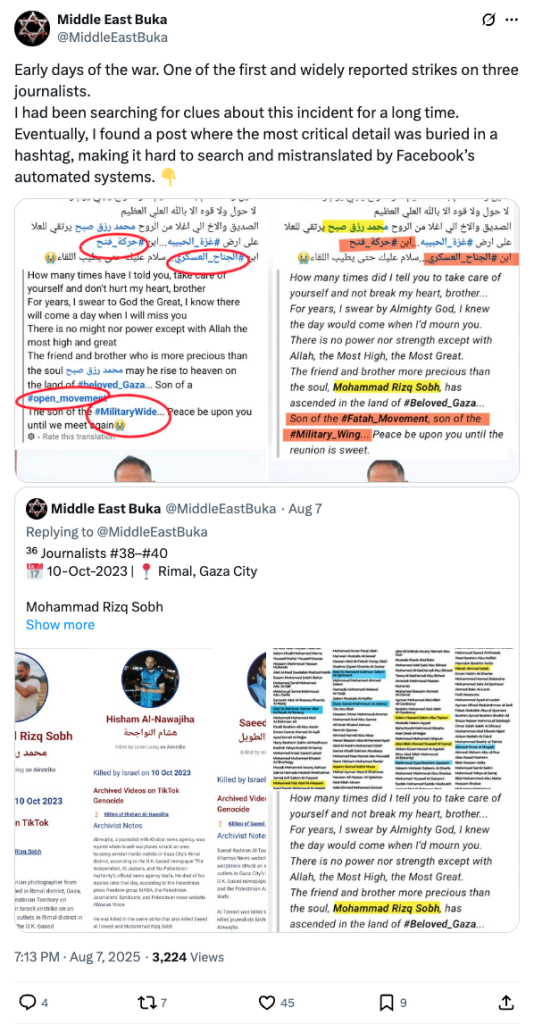 Eventually, I found a post where the most critical detail was buried in a hashtag, making it hard to search and mistranslated by Facebook’s automated systems.