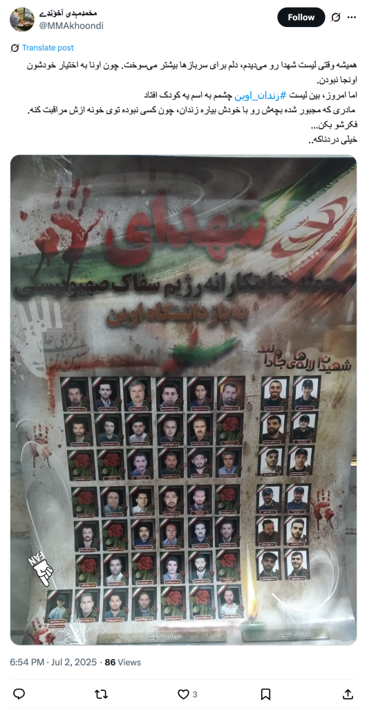 Whenever I saw the list of martyrs, my heart ached for the soldiers the most. Because they weren't there of their own free will. But today, among the list of #Evin_Prison, my eyes fell on the name of a child, a mother who was forced to bring her child to prison with her, because there was no one at home to take care of him. Think about it... it's so painful..