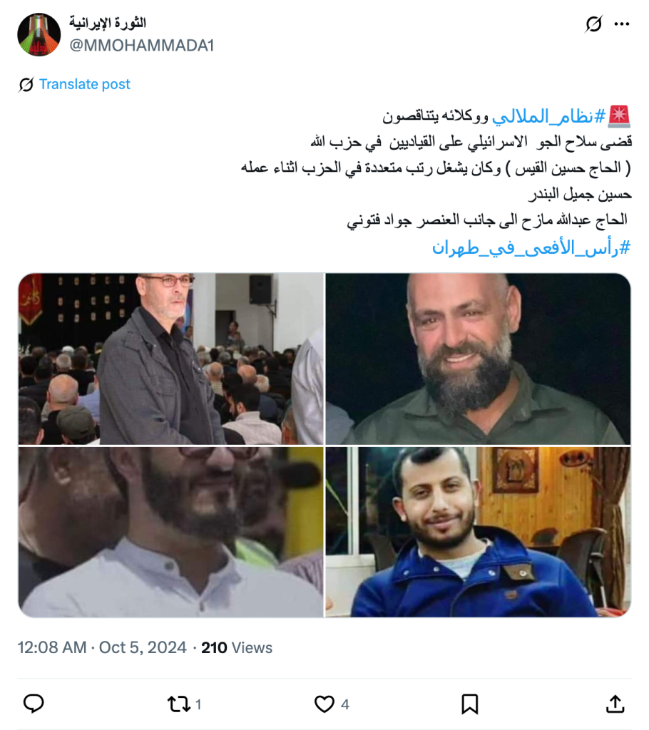 #Mullahs_regime and its agents are decreasing. The Israeli Air Force eliminated Hezbollah leaders (Hajj Hussein Al-Qais), who held various ranks in the party during his work. Hussein Jamil Al-Bandar, Hajj Abdullah Mazah, along with the element Jawad Fattouni. #Head_of_the_Snake_in_Tehran