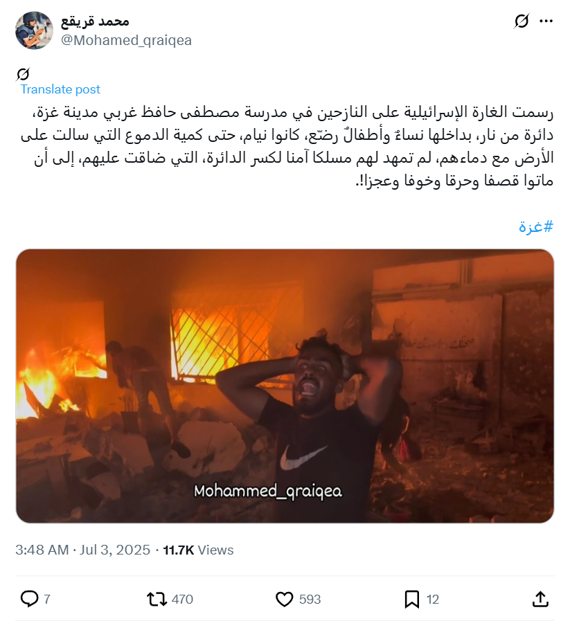 The Israeli airstrike on the displaced people at Mustafa Hafez School, west of Gaza City, created a circle of fire, with women and infants inside, asleep. Even the tears that flowed on the ground, along with their blood, did not pave the way for them to escape safely. The circle tightened around them, until they died from bombing, burning, fear, and helplessness!
