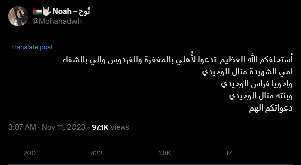 I implore you, by God Almighty, to pray for my family’s forgiveness and paradise, and for my recovery. My martyred mother, Manal Al-Wahidi, my brother, Firas Al-Wahidi, and his daughter, Manal Al-Wahidi. Your prayers are with them.