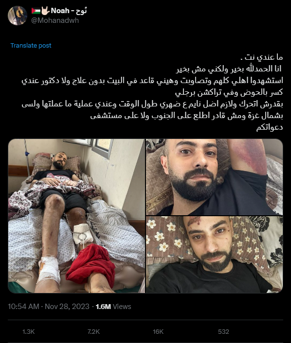 بقدرش اتحرك ولازم اضل نايم ع ضهري طول الوقت وعندي عملية ما عملتها ولسى بشمال غزة ومش قادر اطلع على الجنوب ولا على مستشفى