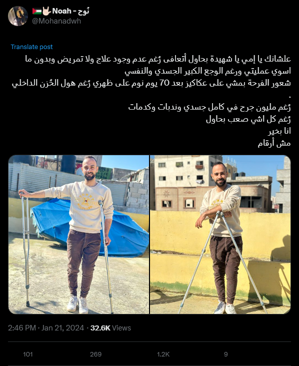 For you, my mother, my martyr, I am trying to recover despite the lack of treatment or nursing, without my surgery, and despite the intense physical and psychological pain.