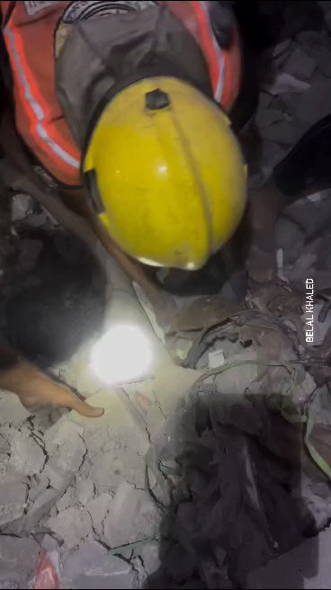 عملية انقاذ بأقل الامكانات من تحت أنقاض منزل حمدان الذي استهدفته طائرات الاحتلال في خانيونس جنوب قطاع #غزة