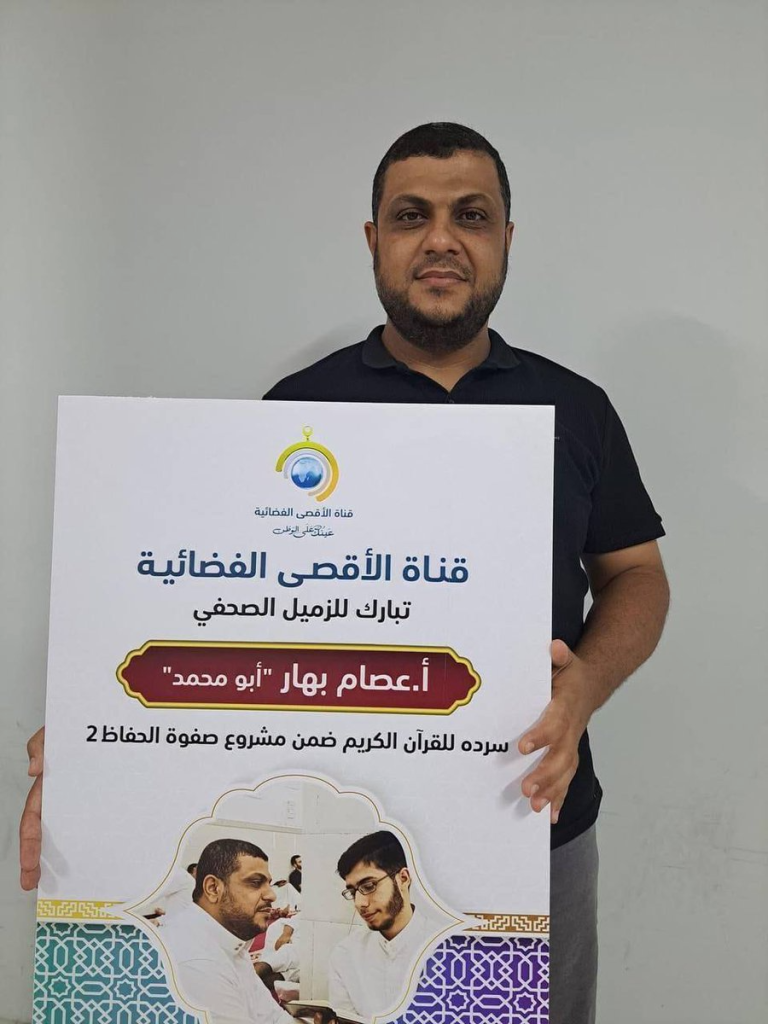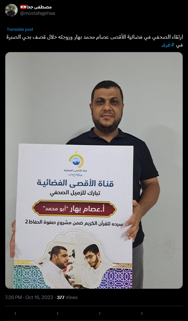 Al-Aqsa TV journalist Issam Mohammed Bahar and his wife were killed in a bombing in the Al-Sabra neighborhood in #Gaza.