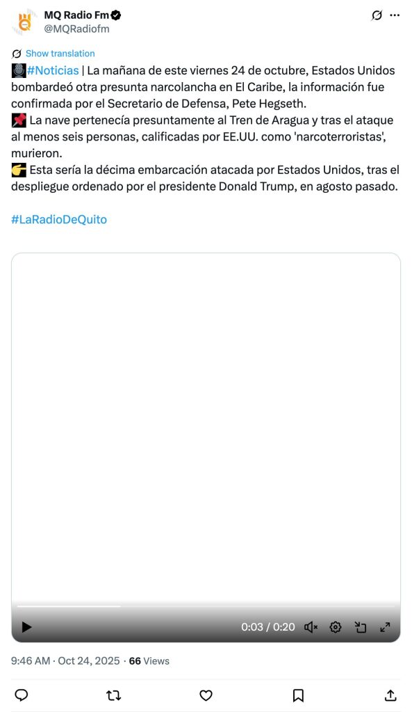 #Noticias | La mañana de este viernes 24 de octubre, Estados Unidos bombardeó otra presunta narcolancha en El Caribe, la información fue confirmada por el Secretario de Defensa, Pete Hegseth.