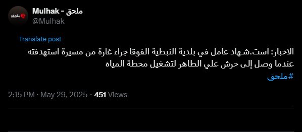 الاخبار: است.شـهاد عامل في بلدية النبطية الفوقا جراء غارة من مسيرة استهدفته عندما وصل إلى حرش علي الطاهر لتشغيل محطة المياه