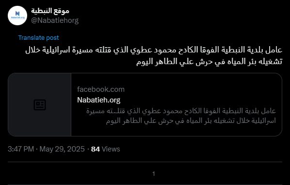 The hardworking Nabatieh al-Fawqa municipality worker, Mahmoud Atwi, was killed by an Israeli drone while operating a water well in the Ali al-Taher forest today.