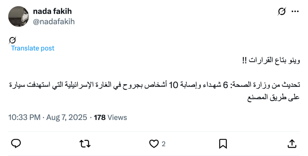 Update from the Ministry of Health: 6 martyrs and 10 injured in an Israeli airstrike targeting a car on the Masnaa Road.