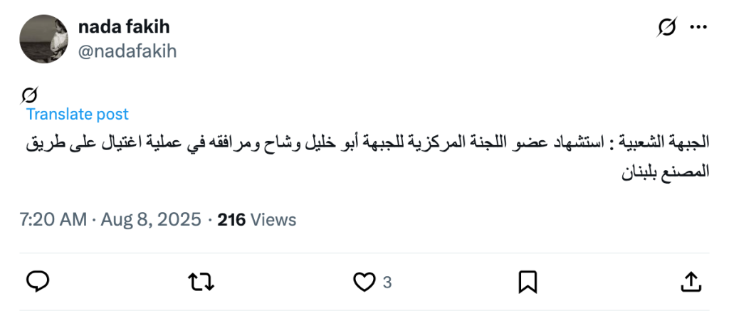 الجبهة الشعبية : استشهاد عضو اللجنة المركزية للجبهة أبو خليل وشاح ومرافقه في عملية اغتيال على طريق المصنع بلبنان