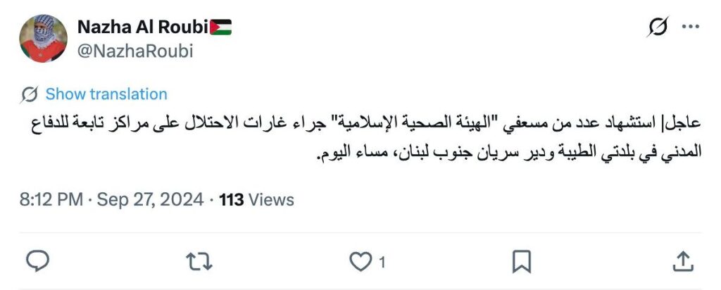 Urgent | A number of paramedics from the "Islamic Health Authority" were martyred as a result of the occupation's raids on civil defense centers in the towns of Taybeh and Deir Siryan in southern Lebanon, this evening.