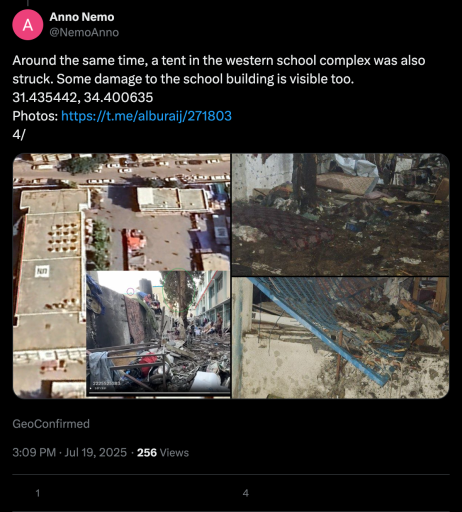 Around the same time, a tent in the western school complex was also struck. Some damage to the school building is visible too.