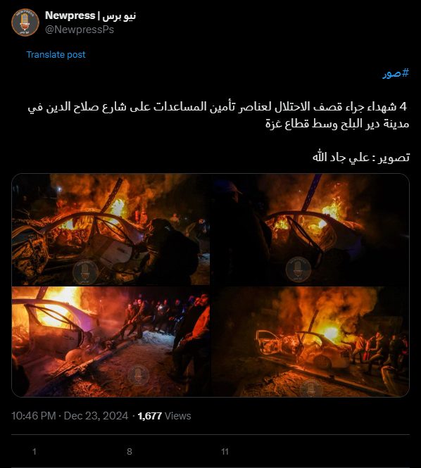 4 شهداء جراء قصف الاحتلال لعناصر تأمين المساعدات على شارع صلاح الدين في مدينة دير البلح وسط قطاع غزة