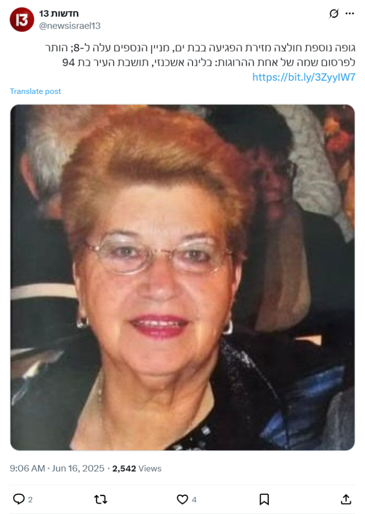 גופה נוספת חולצה מזירת הפגיעה בבת ים, מניין הנספים עלה ל-8; הותר לפרסום שמה של אחת ההרוגות: בלינה אשכנזי, תושבת העיר בת 94