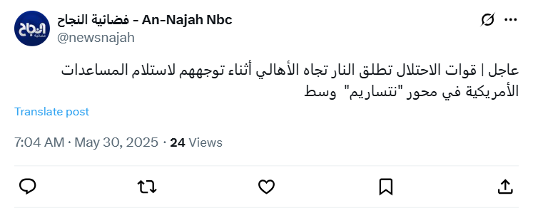 عاجل | قوات الاحتلال تطلق النار تجاه الأهالي أثناء توجههم لاستلام المساعدات الأمريكية في محور "نتساريم" وسط