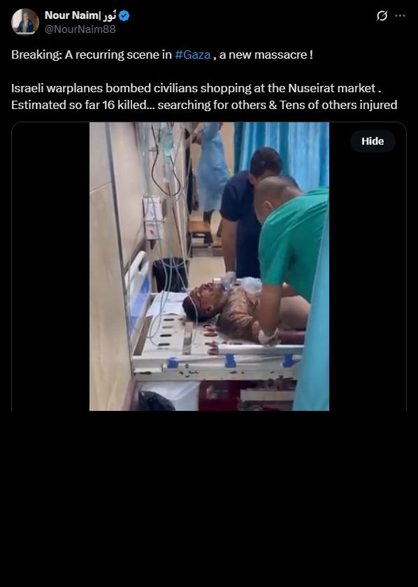Israeli warplanes bombed civilians shopping at the Nuseirat market . Estimated so far 16 killed… searching for others & Tens of others injured