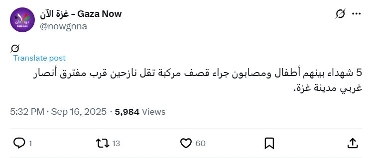 5 شهداء بينهم أطفال ومصابون جراء قصف مركبة تقل نازحين قرب مفترق أنصار غربي مدينة غزة.