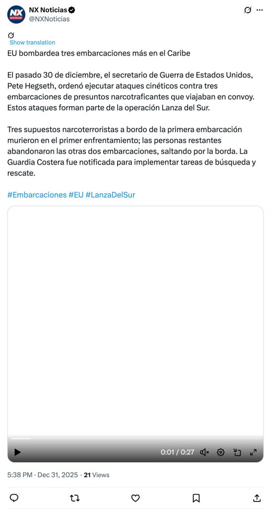 El pasado 30 de diciembre, el secretario de Guerra de Estados Unidos, Pete Hegseth, ordenó ejecutar ataques cinéticos contra tres embarcaciones de presuntos narcotraficantes que viajaban en convoy. Estos ataques forman parte de la operación Lanza del Sur.