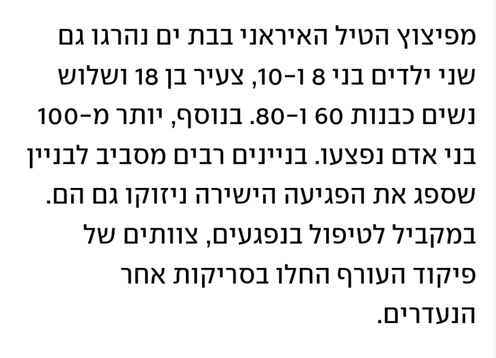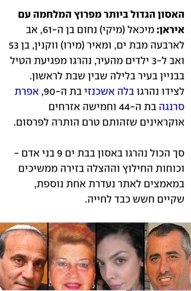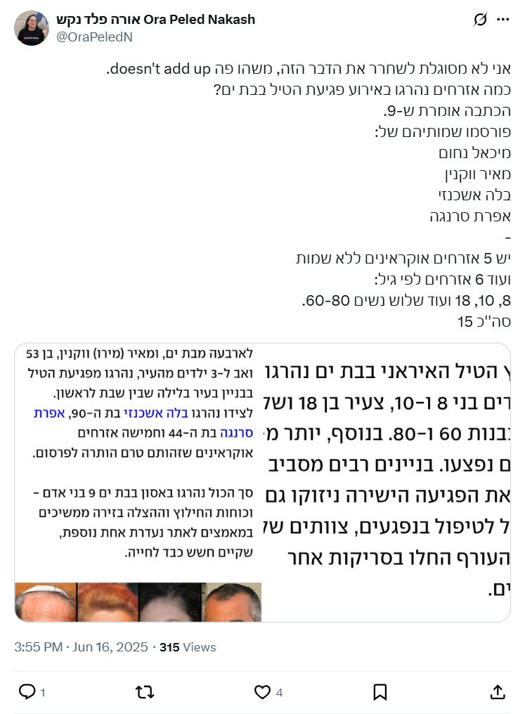 I can't let this thing go, something here doesn't add up. How many civilians were killed in the missile strike in Bat Yam? The article says 9. The names of: Michael Nachum Meir Voknin Bella Ashkenazi Efrat Saranga - There are 5 Ukrainian citizens without names and 6 more citizens by age: 8, 10, 18 and three more women 60-80. Total 15
