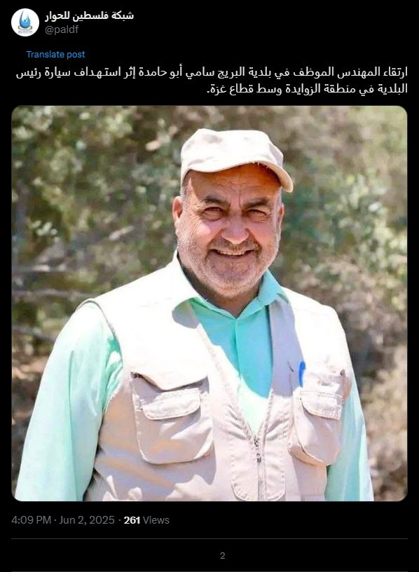 Engineer Sami Abu Hamida, an employee of the Bureij Municipality, was killed when the mayor's car was targeted in the Az-Zawayda area in central Gaza.