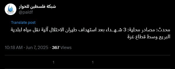 Updated: Local sources: 3 martyrs after Israeli aircraft targeted a water tanker transporting water to the Al-Bureij Municipality in central Gaza Strip.