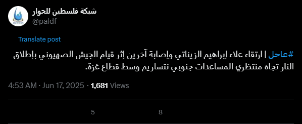 #Urgent | Alaa Ibrahim Al-Zinati was killed and others were injured when the Israeli army opened fire on people waiting for aid south of Netzarim in the central Gaza Strip.