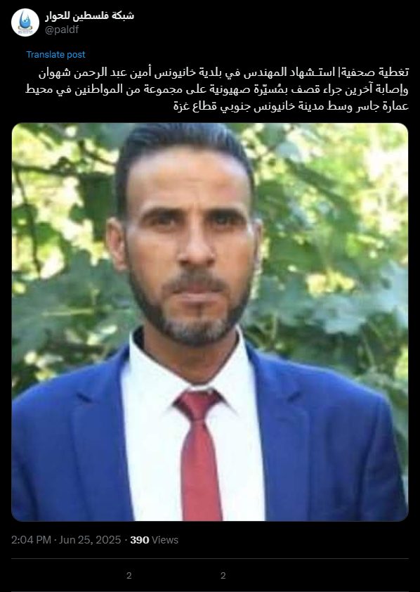 Press coverage | Khan Yunis municipality engineer Amin Abdul Rahman Shahwan was killed and others were injured as a result of an Israeli drone attack on a group of citizens near the Jasser building in the center of Khan Yunis, south of the Gaza Strip.