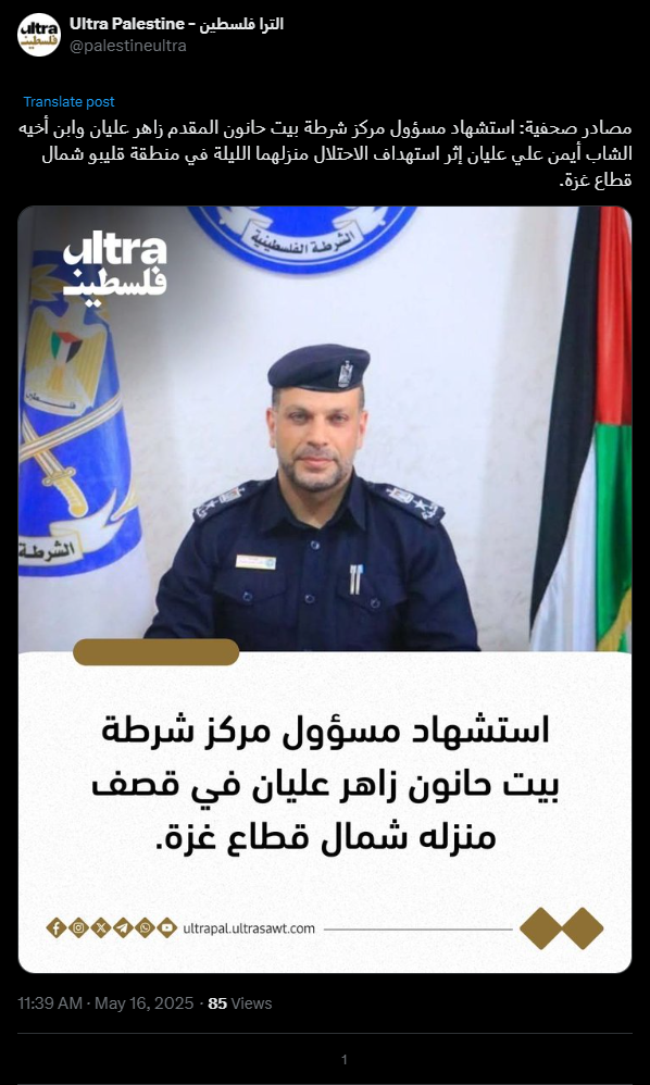 مصادر صحفية: استشهاد مسؤول مركز شرطة بيت حانون المقدم زاهر عليان وابن أخيه الشاب أيمن علي عليان إثر استهداف الاحتلال منزلهما الليلة في منطقة قليبو شمال قطاع غزة.