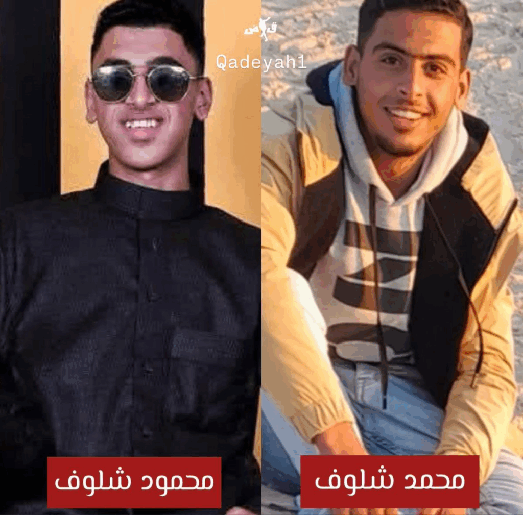 The two young men, Mohammed Mahmoud Abdel Rahman Shalouf and Mahmoud Iyad Mahmoud Shalouf, were killed as a result of targeting a group of citizens in the Mawasi area of Rafah city.