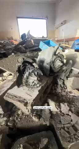 Remains of a drone used by the occupation forces to target martyred journalist Hassan Aslih while he was receiving treatment in the burns department at Nasser Medical Complex in Khan Yunis.