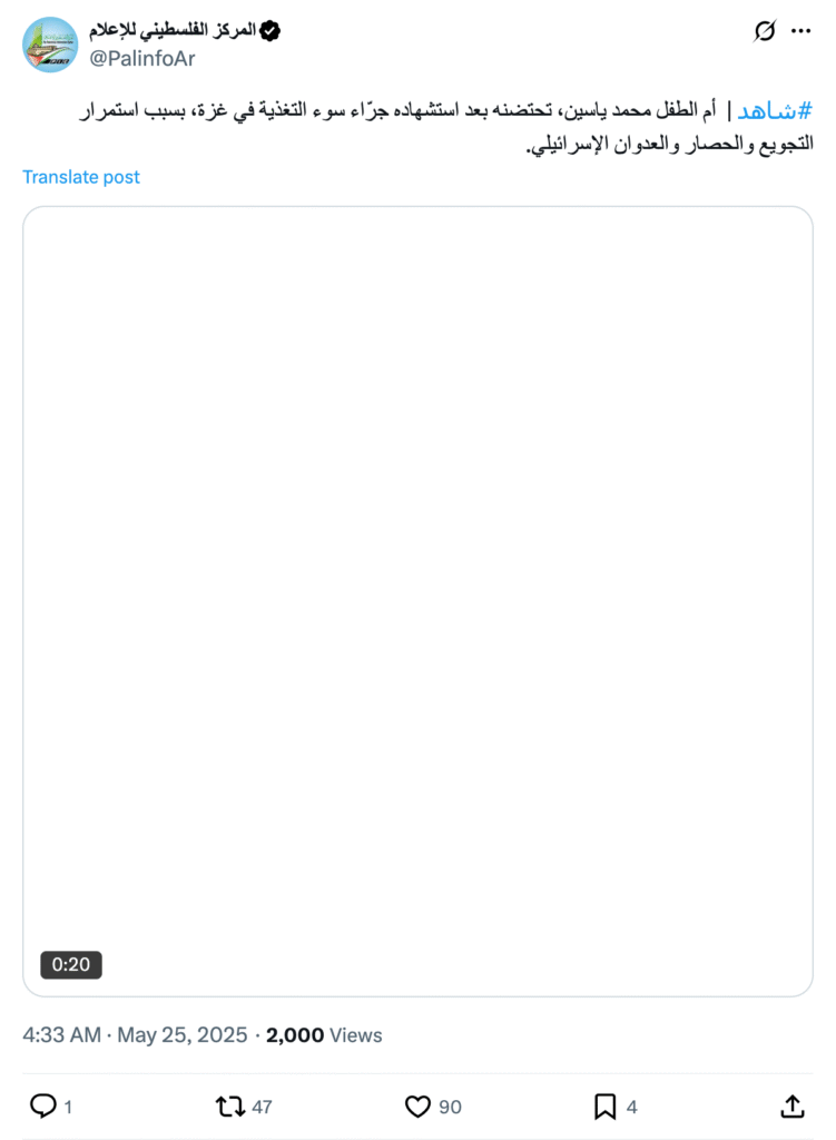 #شاهد | أم الطفل محمد ياسين، تحتضنه بعد استشهاده جرّاء سوء التغذية في غزة، بسبب استمرار التجويع والحصار والعدوان الإسرائيلي.