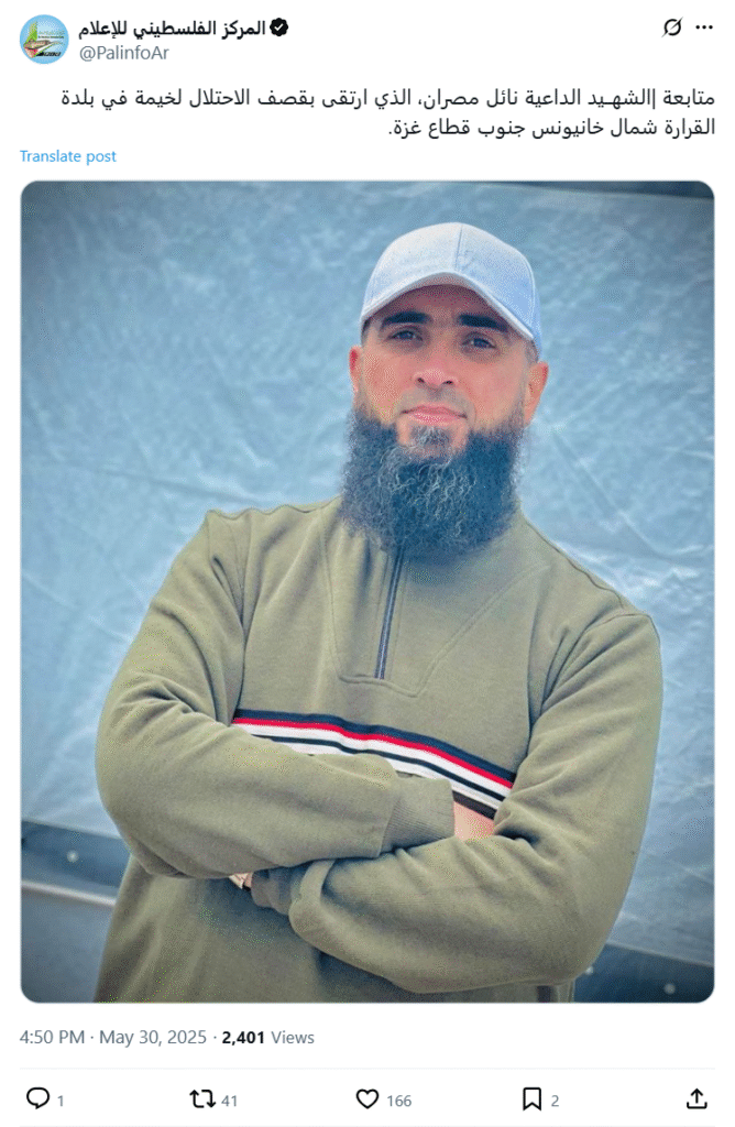 متابعة |الشهــيد الداعية نائل مصران، الذي ارتقى بقصف الاحتلال لخيمة في بلدة القرارة شمال خانيونس جنوب قطاع غزة.