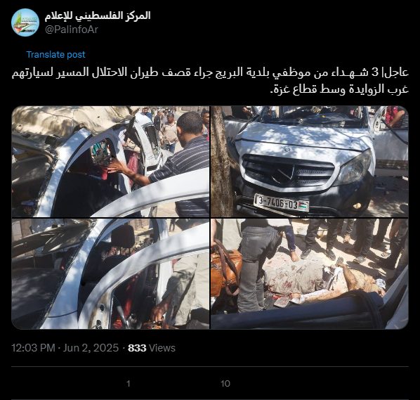 Urgent | 3 Al-Bureij municipality employees martyred as a result of an Israeli drone attack on their car west of Al-Zawayda, central Gaza Strip.