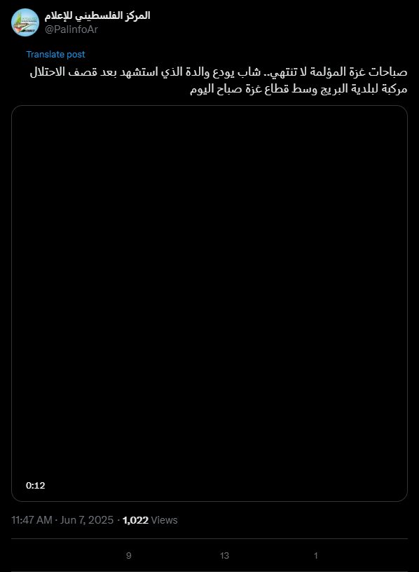Gaza's painful mornings never end. A young man bids farewell to the mother of a man killed after the occupation forces bombed a vehicle belonging to the Al-Bureij municipality in central Gaza this morning.