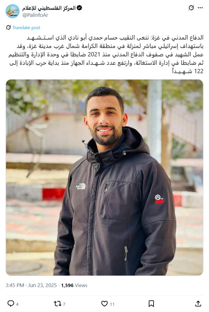 الدفاع المدني في غزة: ننعى النقيب حسام حمدي أبو نادي الذي اســتــشــهــد باستهداف إسرائيلي مباشر لمنزلة في منطقة الكرامة شمال غرب مدينة غزة، وقد عمل الشهيد في صفوف الدفاع المدني منذ 2021 ضابطا في وحدة الإدارة والتنظيم ثم ضابطا في إدارة الاستغاثة، وارتفع عدد شــهــداء الجهاز منذ بداية حرب الإبادة إلى 122 شــهــيــداً