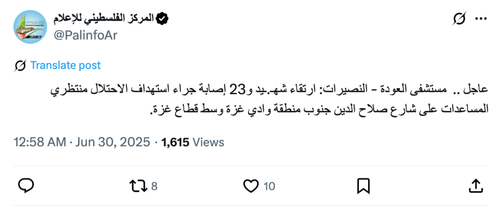 Urgent .. Al-Awda Hospital - Nuseirat: One martyr and 23 injured as a result of the occupation targeting those waiting for aid on Salah al-Din Street, south of the Wadi Gaza area in the central Gaza Strip.