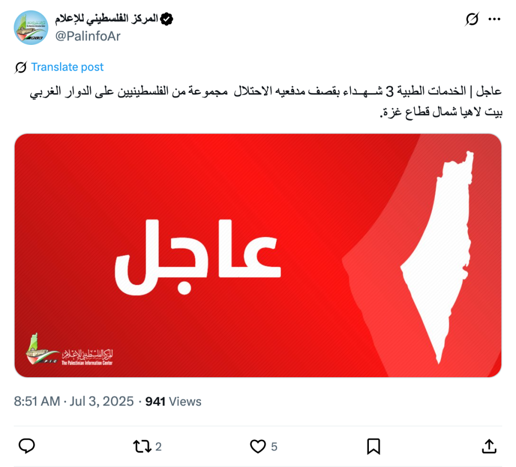 عاجل | الخدمات الطبية 3 شــهــداء بقصف مدفعيه الاحتلال مجموعة من الفلسطينيين على الدوار الغربي بيت لاهيا شمال قطاع غزة.