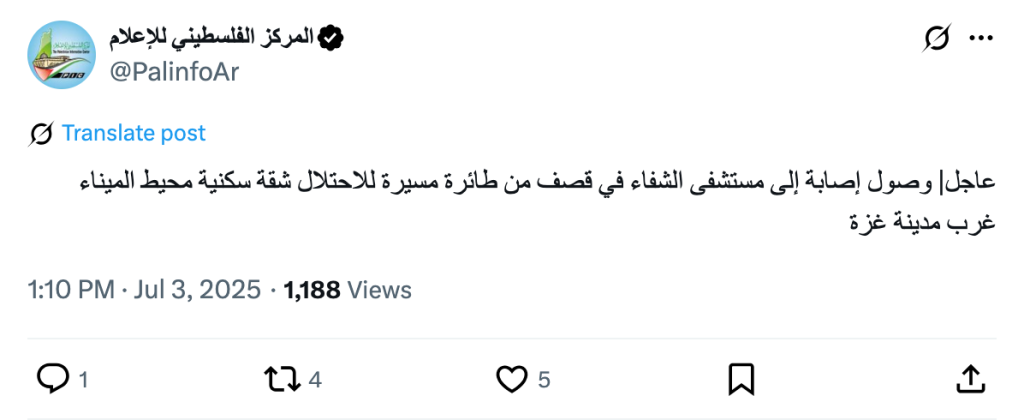 Urgent | An injured person was taken to Al-Shifa Hospital after an Israeli drone bombed an apartment building near the port, west of Gaza City.