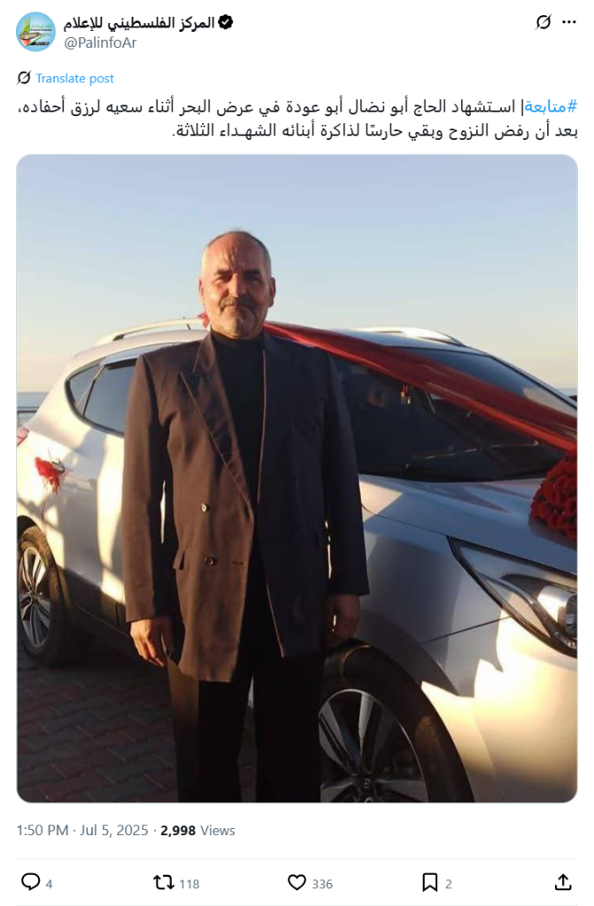 #Follow-up | Hajj Abu Nidal Abu Odeh was martyred at sea while trying to provide for his grandchildren, after refusing to flee and remaining a guardian of the memory of his three martyred sons.