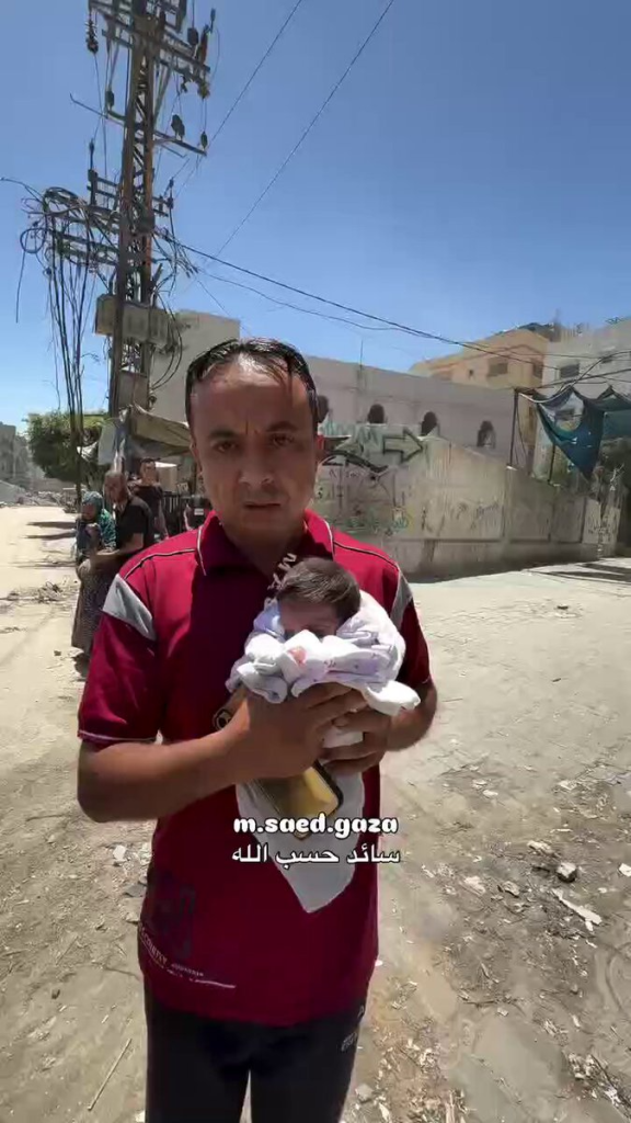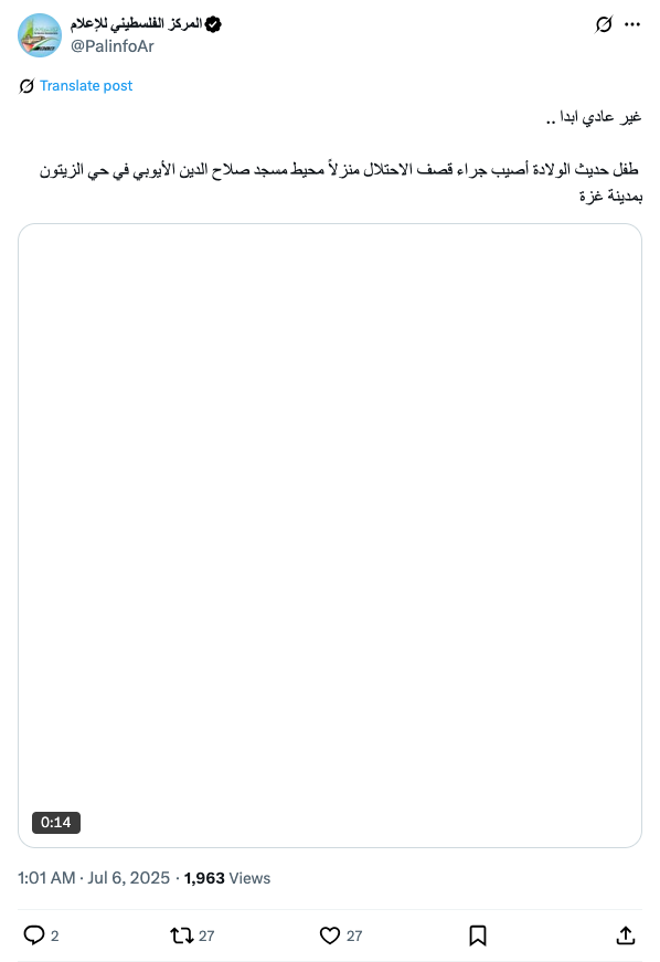 طفل حديث الولادة أصيب جراء قصف الاحتلال منزلاً محيط مسجد صلاح الدين الأيوبي في حي الزيتون بمدينة غزة