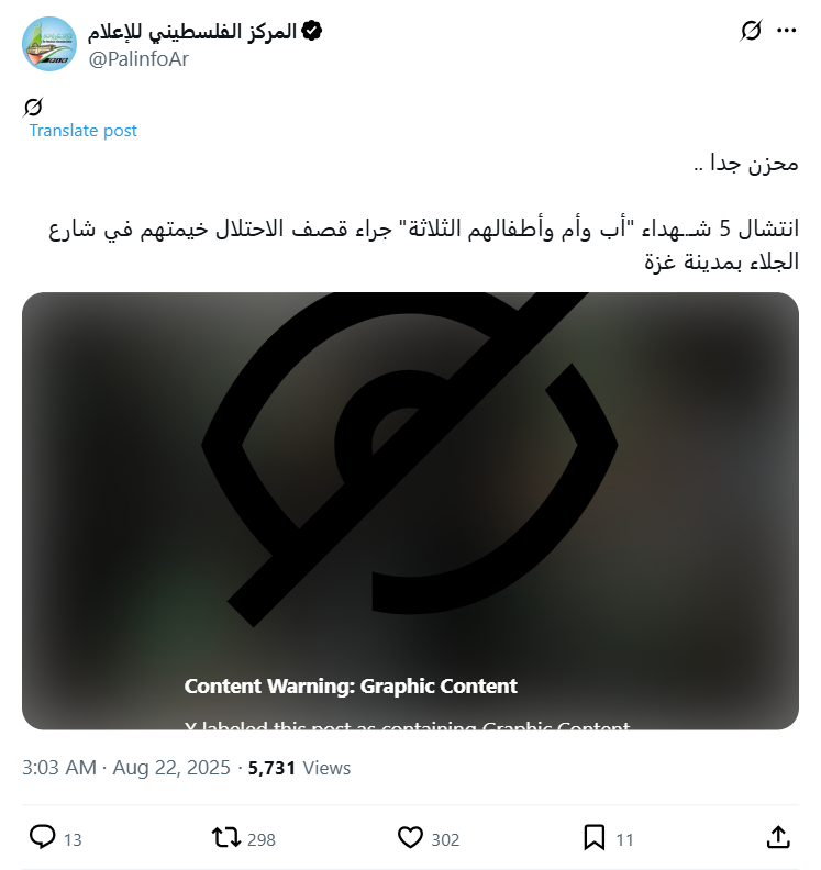Five martyrs, a father, a mother, and their three children, were recovered after the occupation forces bombed their tent on Al-Jalaa Street in Gaza City.