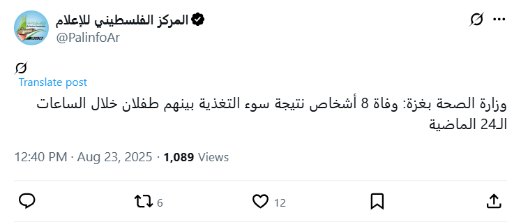 Gaza Ministry of Health: Eight people, including two children, died of malnutrition in the past 24 hours.