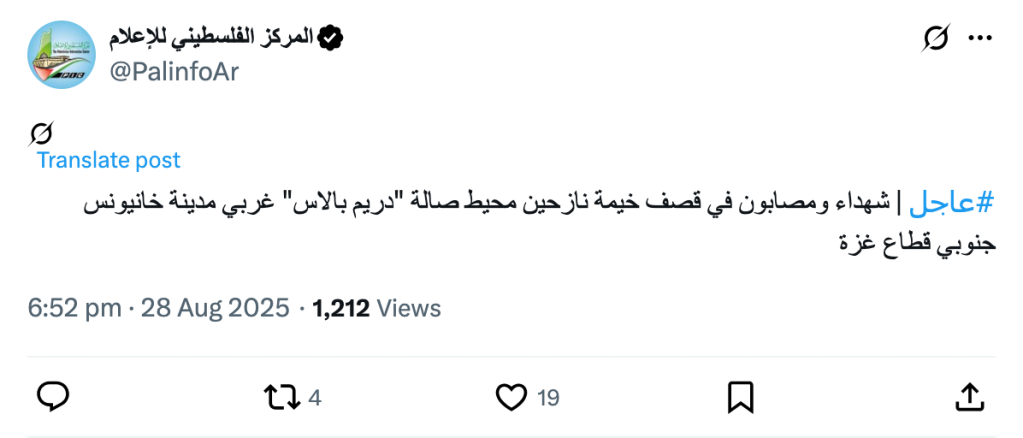 #Urgent | Martyrs and wounded in the bombing of a displaced persons' tent near the Dream Palace Hall, west of Khan Yunis, in the southern Gaza Strip.