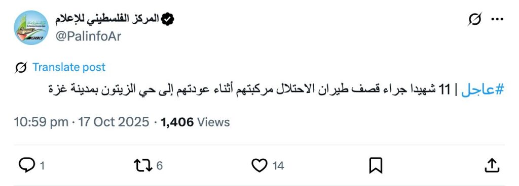 #عاجل | 11 شهيدا جراء قصف طيران الاحتلال مركبتهم أثناء عودتهم إلى حي الزيتون بمدينة غزة