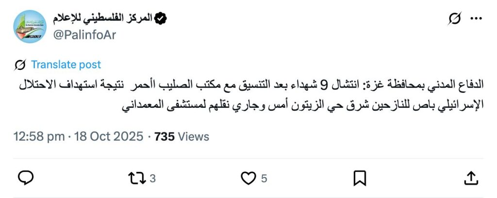 Civil Defense in Gaza: 9 martyrs were recovered after coordination with the Red Cross office, as a result of the Israeli occupation targeting a bus carrying displaced persons east of the Zeitoun neighborhood yesterday. They are being transferred to the Baptist Hospital.