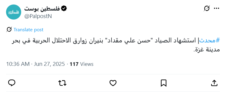#Updated | Fisherman Hassan Ali Muqdad was killed by Israeli gunboats off the coast of Gaza City.