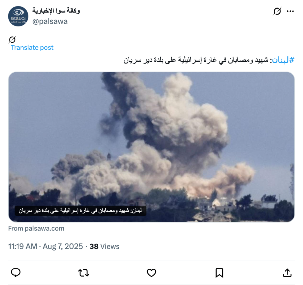 #لبنان: شهيد ومصابان في غارة إسرائيلية على بلدة دير سريان