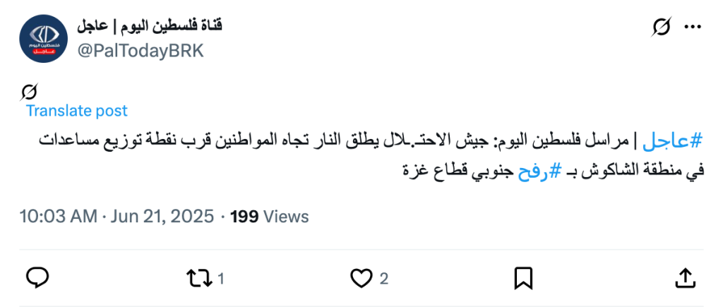 #Urgent | Palestine Today correspondent: The occupation army opened fire on citizens near an aid distribution point in the Al-Shakoush area in #Rafah, south of the Gaza Strip.
