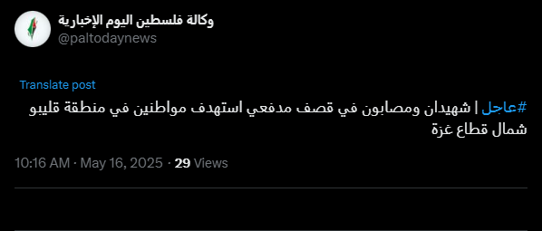 #Urgent | Two martyrs and wounded in artillery shelling targeting citizens in the Qalibu area, north of the Gaza Strip.